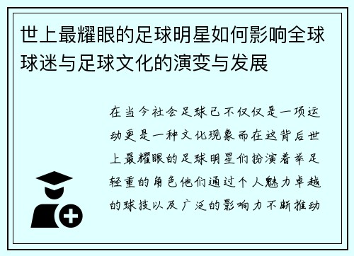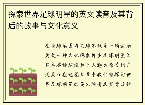 随着中国足球的持续发展,越来越多的人开始关注和思考中国足球的崛起之路。在这一过程中,韩国足球明星们的表现成为了一个重要的对比和借鉴对象。本文将从四个方面深入探讨“痛击韩国足球明星的背后故事与中国足球崛起的希望之路”。首先,我们将分析韩国足球明星在国际赛场上的成就及其背后的努力,其次,我们将讨论中国足球的发展现状以及面临的挑战,接着探讨中国青训体系的重要性,最后展望未来中国足球在国际舞台上的可能突破...